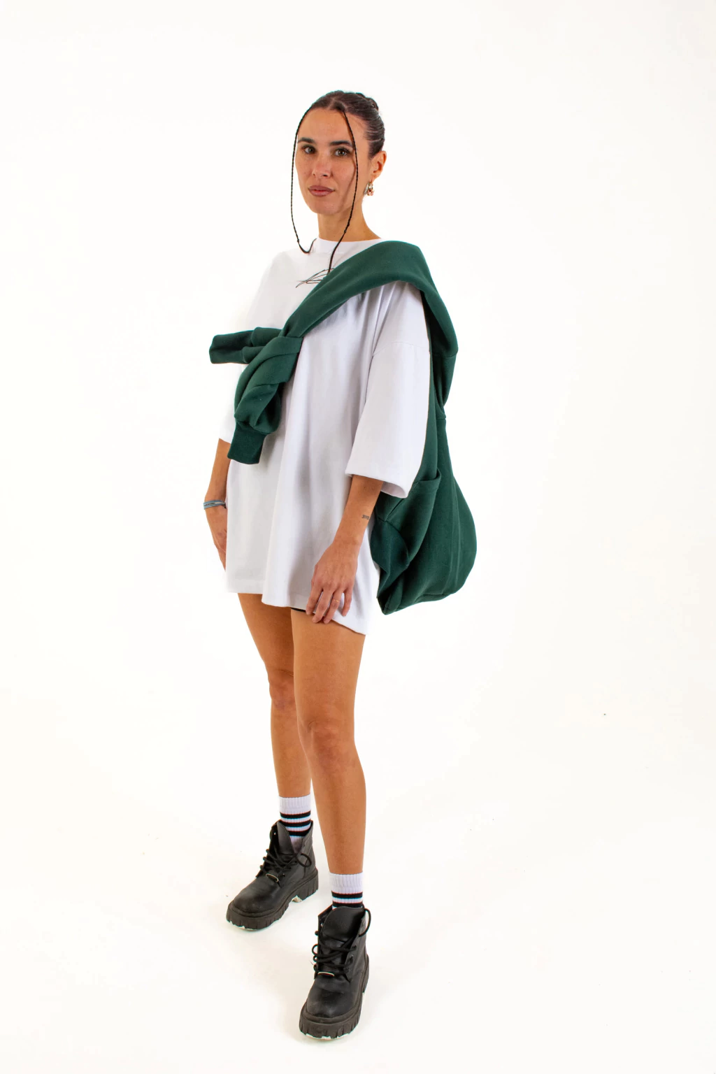 Remera oversize blanca, cuello con rib. Estampe en frente.